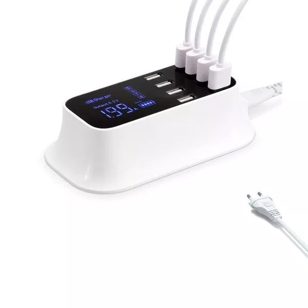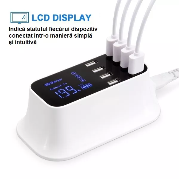 Alimentator incarcator 100-240VAC – 8x USB 8A 40W cu display alb