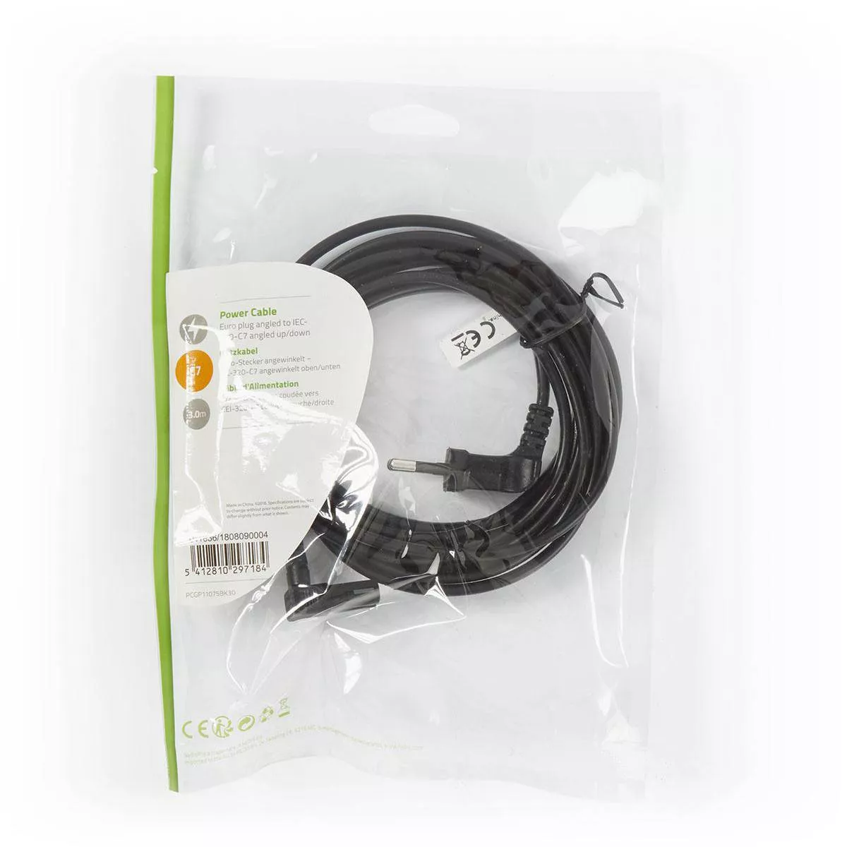 Cablu de alimentare | Euro Plug Anged – IEC-320-C7 Înclinat în sus / jos | 3,0 m | Negru.