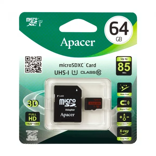 Card microSDXC UHS-I Apacer, 64GB, clasa10 cu adaptor SD.