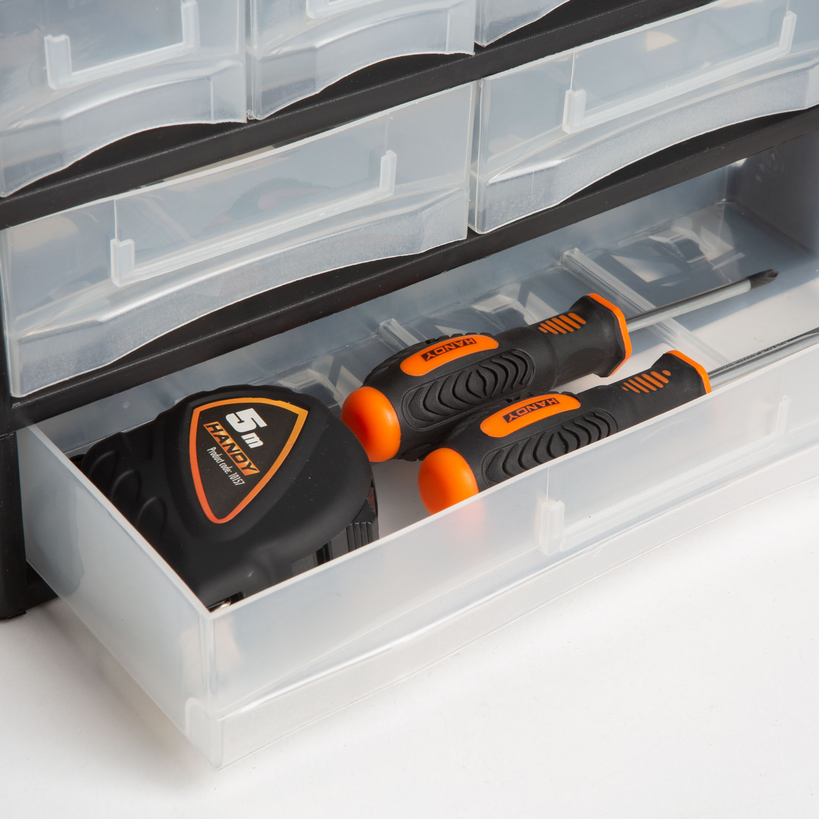 Puteți face o muncă eficientă numai în condiții ordonate! Păstrați piesele mici, șuruburile, diblurile, cuiele, întrerupătoarele sau alte componente electronice necesare pentru lucru separate după dimensiune și tip cu acest organizator portabil.