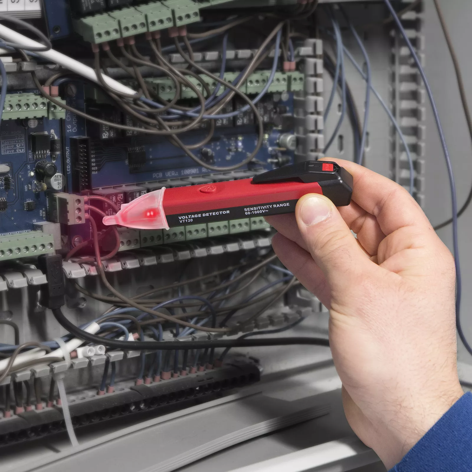 Pt. detectarea tensiunilor de CA fara contact direct, cu semnalizare acustica si LED.