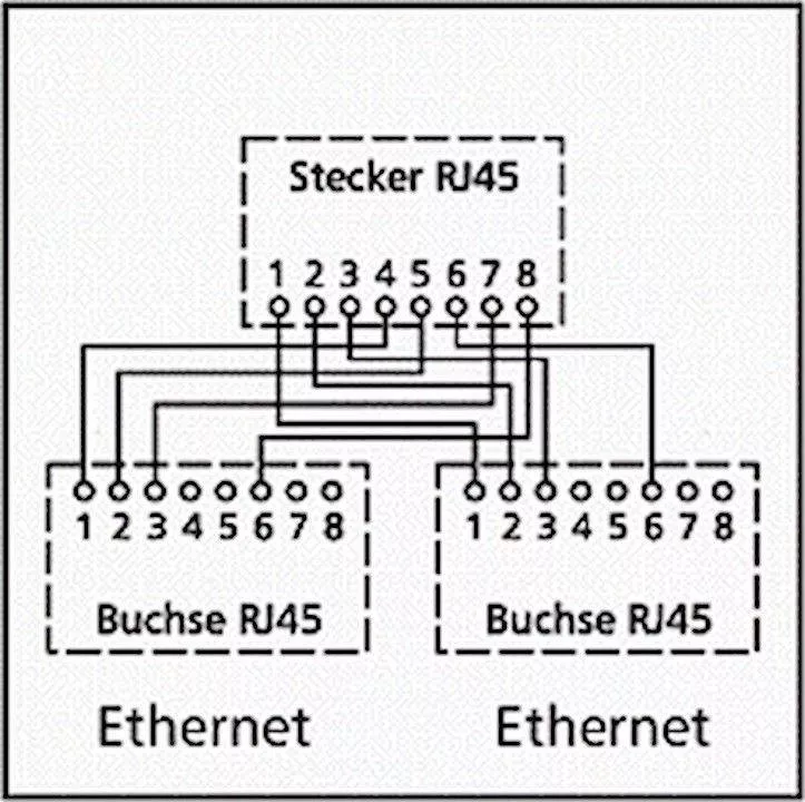 Adaptor de partajare a cablurilor pentru funcționarea simultană a două servicii cu 4 fire, aici: Ethernet 2x, printr-un cablu de instalare cu 8 nuclee