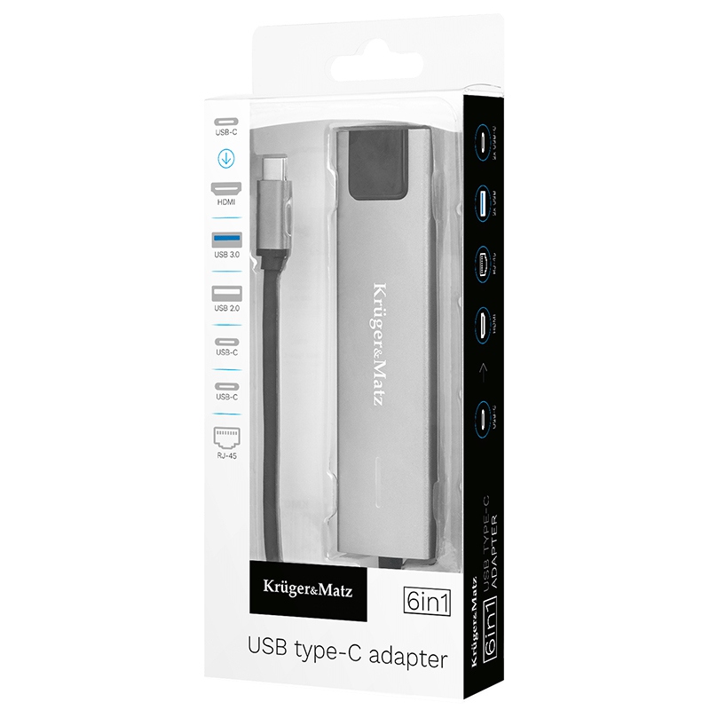 HUB 6in1 USB TYPE C – HDMI v1.4 3840x2160px 30Hz + 2x USB3.0/2.0 + 2x USB TYPE C + RJ45 Kruger&Matz