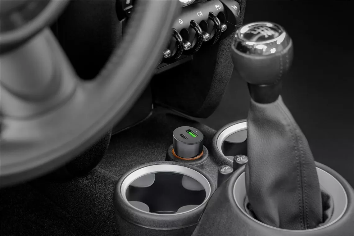 Încărcătorul în format mini încarcă două dispozitive simultan pe brichetă prin USB-A sau USB-C™