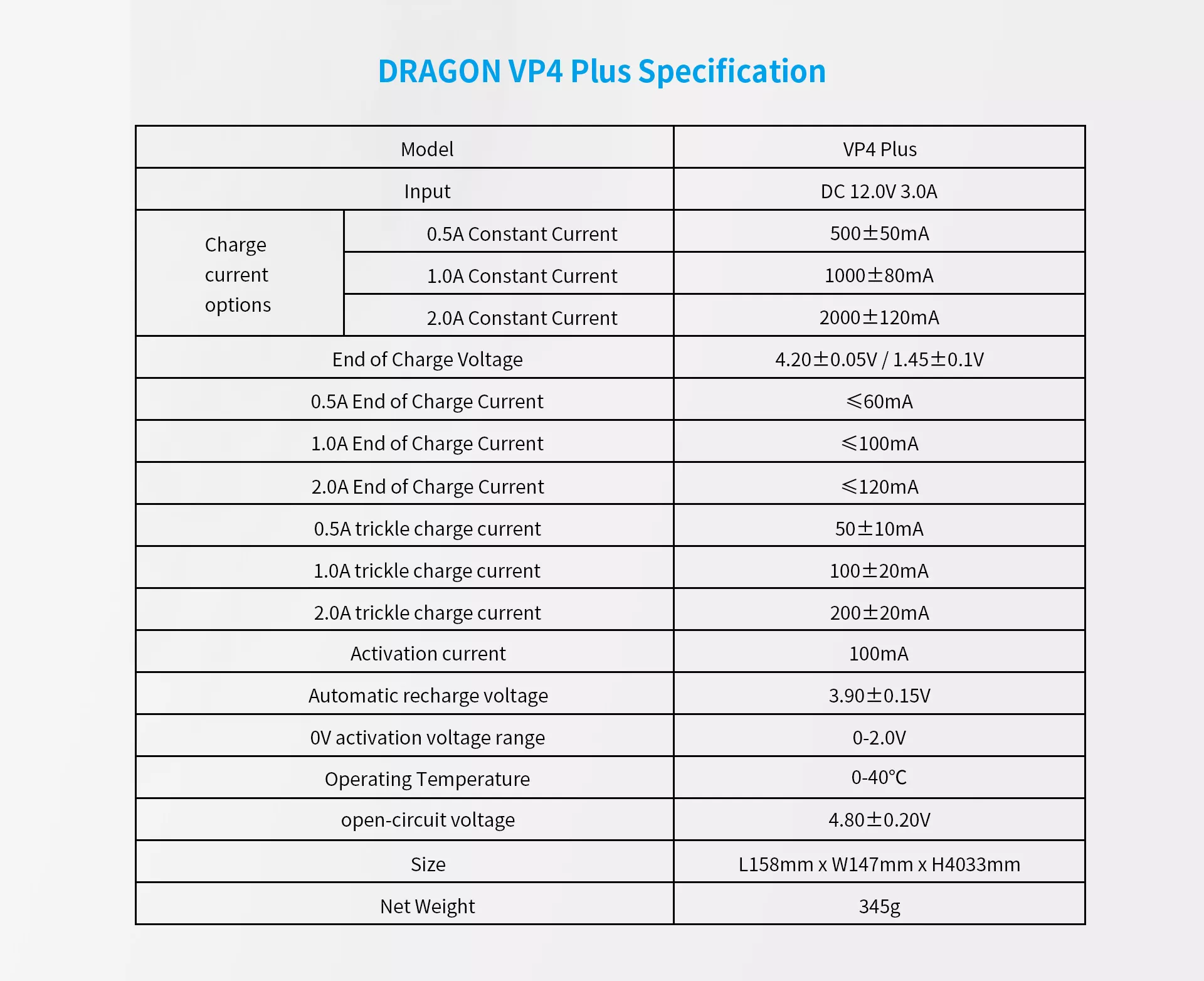 Pachet Cuprins: DRAGON VP4 Plus Charger , Încărcător husă O pereche de sonde 12V/3A adaptor 3A adaptor auto Manual