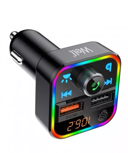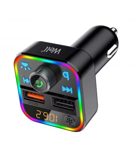 Transmițător FM Bluetooth cu lumini LED RGB. Acest dispozitiv poate să redea muzică și apeluri direct de pe dispozitivul Bluetooth către sistemul FM stereo al mașinii.