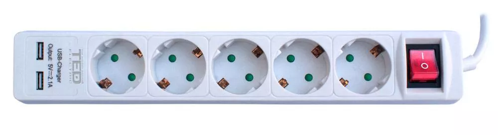Prelungitor 5m 5 prize Schuko +2 iesiri USB 2.1A +intrerupator 3x1mm 10A 2300W TED.