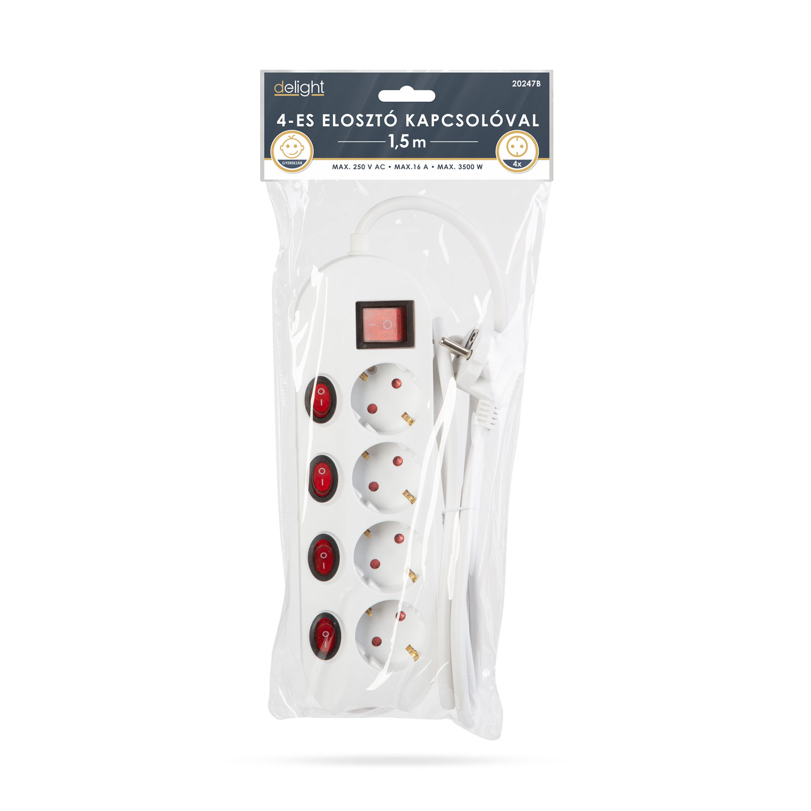 Prelungitor cu 4 prize si buton 4+1 250V 16A 3500W conductor 3×1.50mm2 1.5m alb Delight
