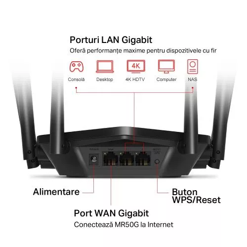 Tehnologia MU-MIMO permite routerului MR50G sa comunice cu mai multe dispozitive in acelasi timp, marind throughput-ul general al retelei
