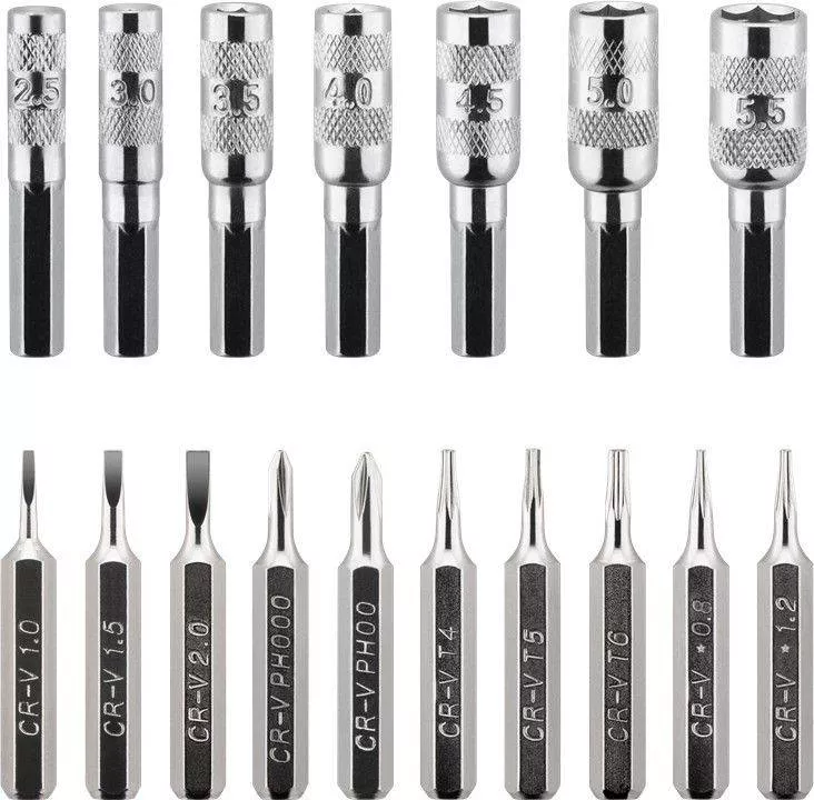 Set surubelnita 17biti CrV 3x capete plane 1mm 1.5mm 2mm 2x Phillips PH000 PH00 3x Torx T4 T5 T6 2x stele Star 0.8 1.2 7x hexago