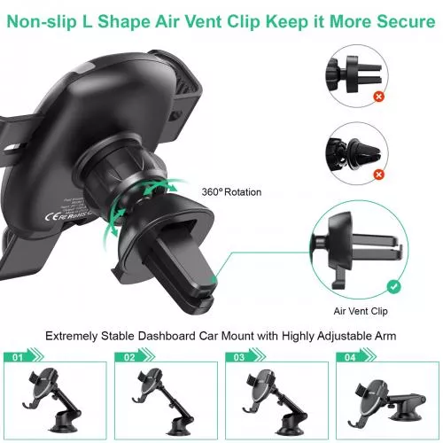 Combina un suport de telefon pentru masina si un incarcator de masina fara fir ca suport cu prindere de aerisire. Pur si simplu glisati telefonul in jos, il prindeti in siguranta si incarcati simultan, operare usoara cu o singura mana intr-o secunda!