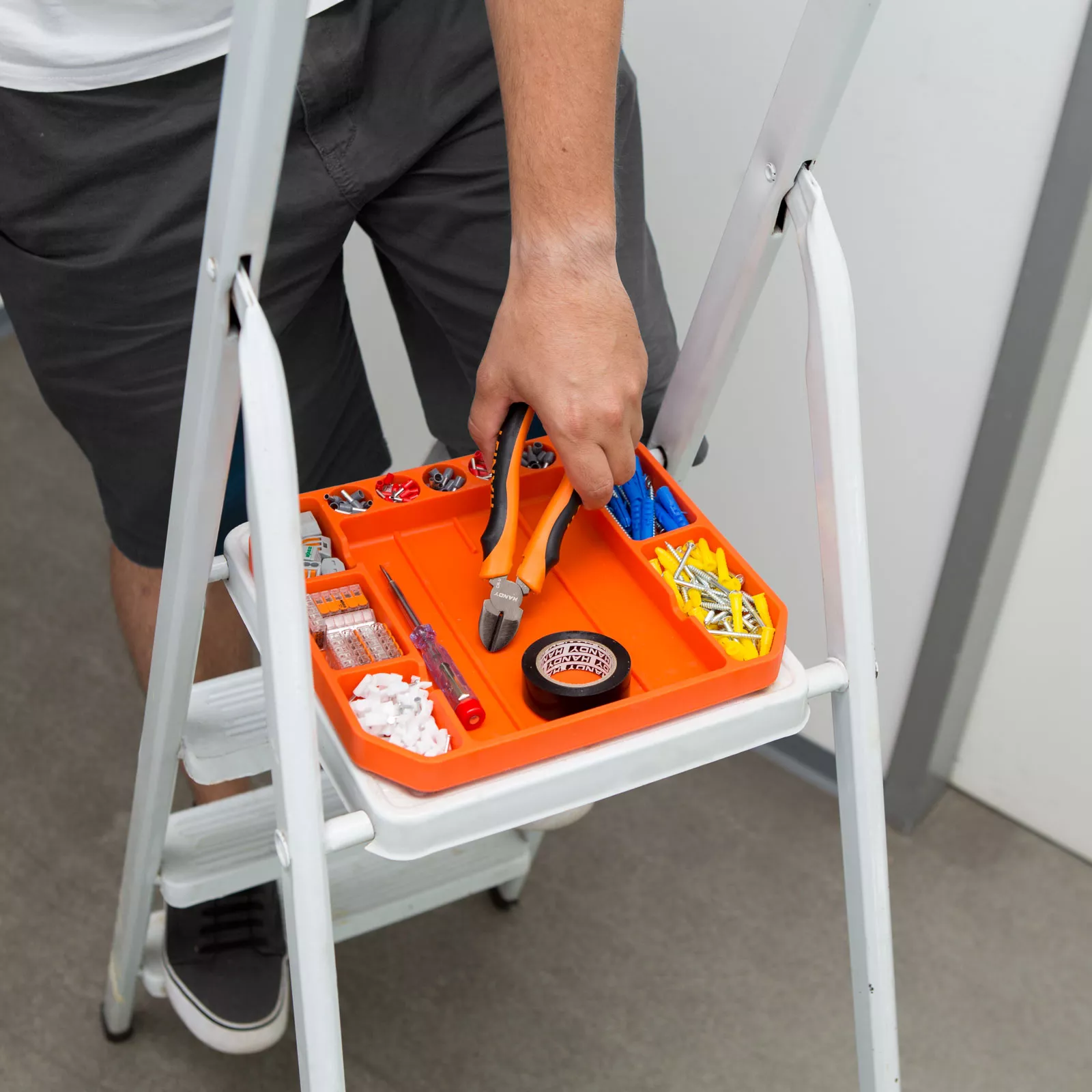 Șuruburile și componentele necesare pentru montaj pot fi manipulate în mod ordonat și separat. La așezarea uneltelor, tava absoarbe șocurile pentru a nu le deteriora suprafața.