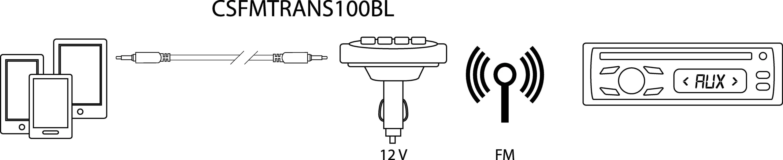 Transmitter to connect to an MP3 player or smartphone with the included 3.5-mm stereo headphone mini jack cable to play track lists via a car radio.